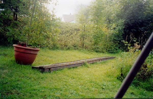 Bauzustand von 2000! In diesem Jahr sind ca. 30 Obstbäume der Axt zum Opfer gefallen und einige Baumwurzeln, die später im Weg wären, entfernt worden. Zuerst wurde ein Teil der Strecke auf Holzpfählen gestellt, um Steigungen auszumessen, den entgültigen Streckenverlauf zu ermitteln und um zu prüfen, ob sich vielleicht doch ein Fehler im Plan eingeschlichen hat. |