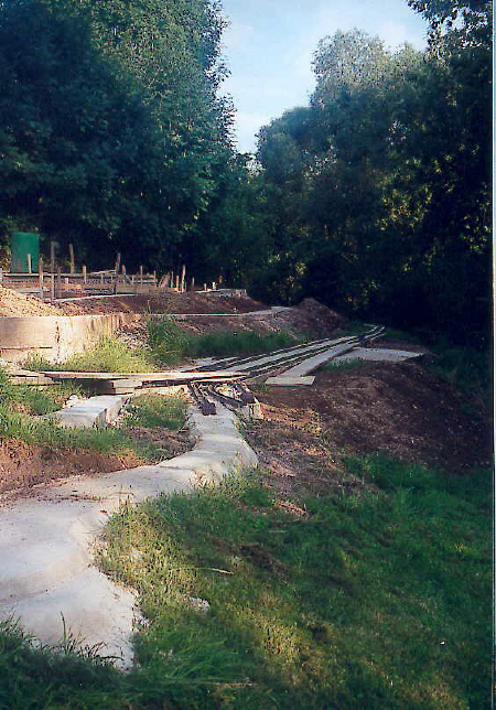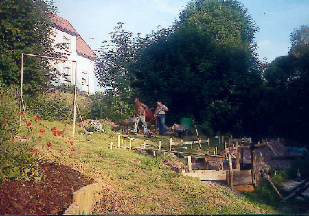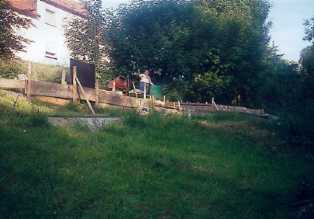 Auch hier noch einmal der Blick von Filisur den Berg hinauf. Deutlich zu erkennen ist die Verschalung, in die nachher Beton gegossen wird. Teilweise müssen wir das Trasse bis auf 60 cm über dem Boden hoch betonieren.